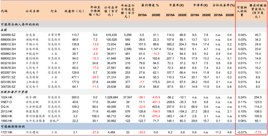 2月13日,msci季度调整结果显示,msci中国全流通指数(msci china all shares indexes)中,将会有9家新增成分股公司,其中市值前三大公司包括京沪高铁,中国人保和金山办公,另有3家剔除;msci中国全流通小盘股中,将会有2家. 调整时间表与潜在影响: 8 月 13 日公布, 9 月 1 日生效; 8 月 31 日通常有 大量调仓 msci 季度调整:预计相对平淡;初步筛选 5 只股票或符合纳入条件 msci 将于北京时间 8 月 13 日 凌晨 (金麒麟分析师) 公布其定期的常规季度指数调整结果。 指數編纂公司 msci (明晟)將於12日凌晨公布季度調整結果,預計31日收盤生效。 投顧法人表示,msci指數持續加碼中國股市的趨勢不變,研判 台股 權重將小幅調降,為近10次msci調整連續被下調權重。
